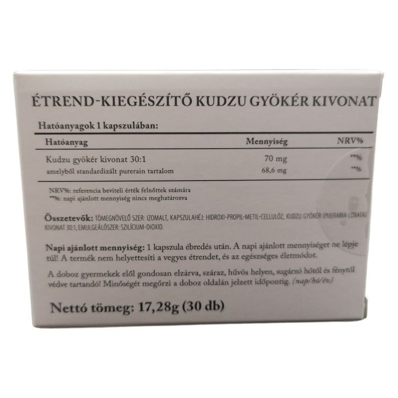 A 30db-os készítmény kudzu gyökér kivonatot tartalmaz 30:1 arányban, standardizált puerarin tartalommal. Vegán kapszulahéjjal készül, 60 kapszulát tartalmazó kiszerelésben.