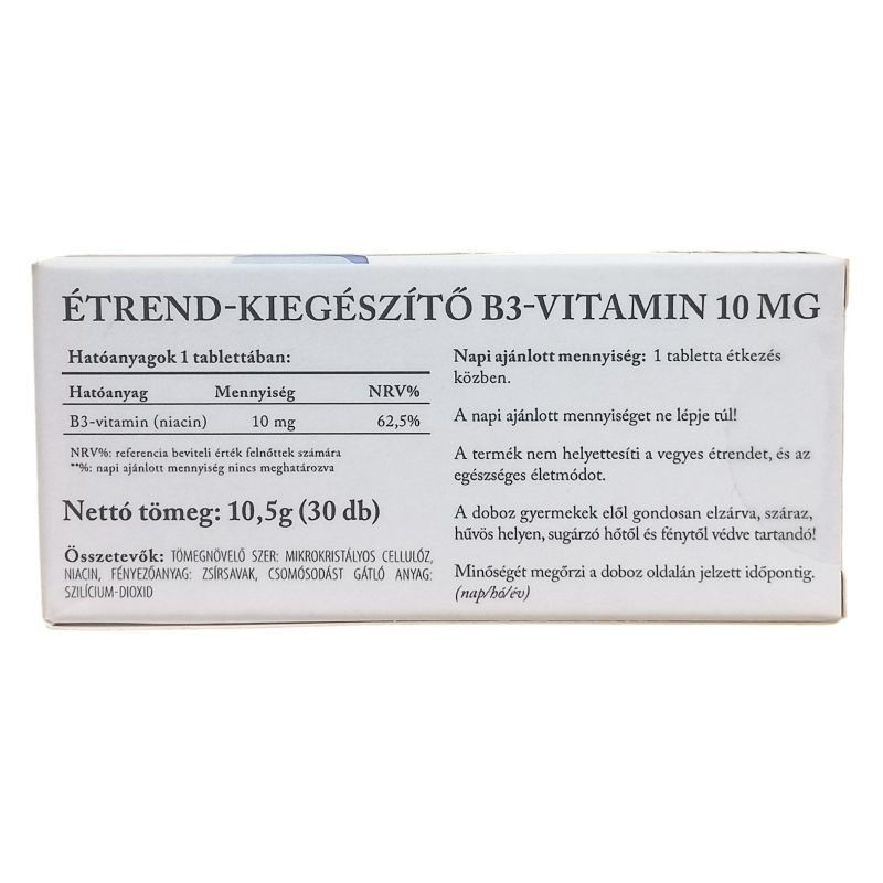 Hatóanyagok 1 tablettában: B3-vitamin 10 mg 62,5%.