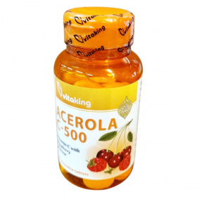 A Vitaking ACEROLA C-500 rágótabletta 500 mg C-vitamint tartalmaz, amely hozzájárulhat az immunrendszer normál működéséhez. A termék málna ízesítéssel készült, és további összetevői között megtalálható a málna por, hajdina por, acerola cseresznye kivonat, citrus bioflavonoid, rutin és heszperidin. A termék cukorral és édesítőszerrel készült, és figyelmeztetést tartalmaz a túlzott fogyasztás hashajtó hatásáról. A termék tárolása száraz, hűvös helyen javasolt, gyermekek elől elzárva.