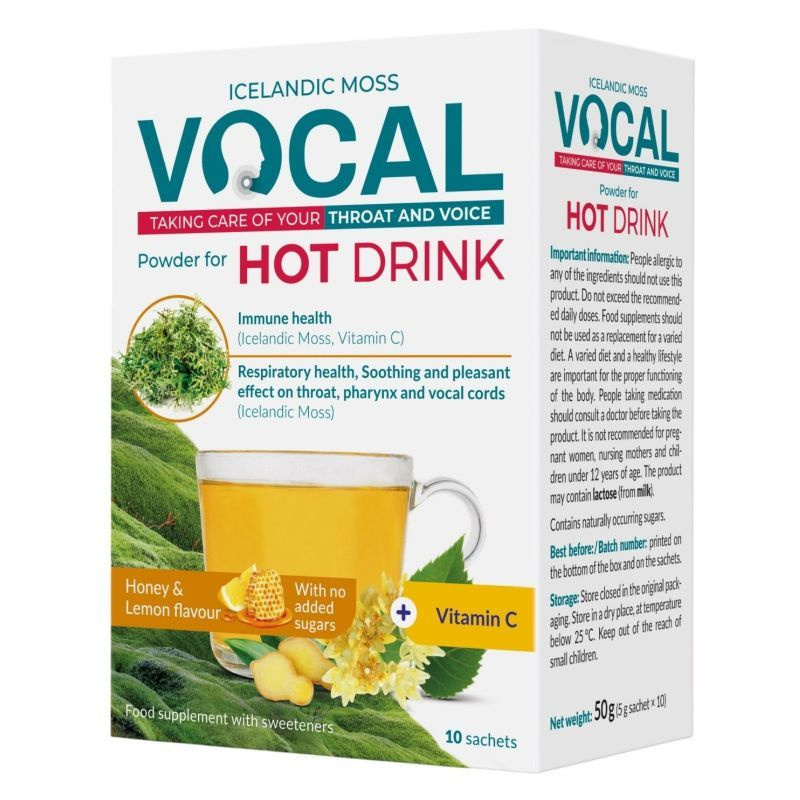 A VOCAL Méz-citrom ízű forró italpora Izlandi zuzmó, hársfavirág-, gyömbér-, ökörfarkkóró-, bodzavirágkivonatot és C-vitamint is tartalmaz.