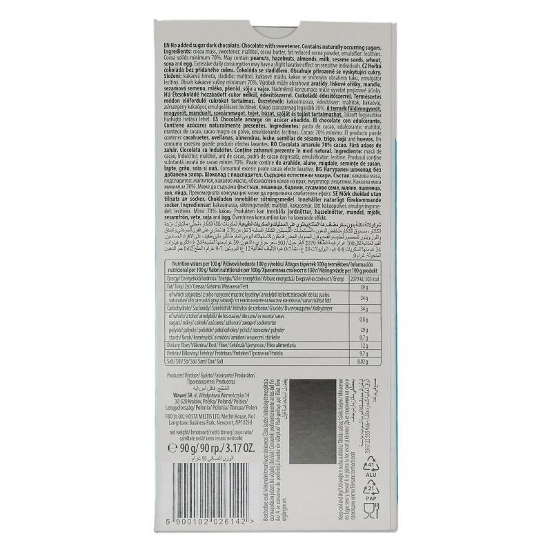 Étcsokoládé 70%, hozzáadott cukrot nem tartalmaz.
