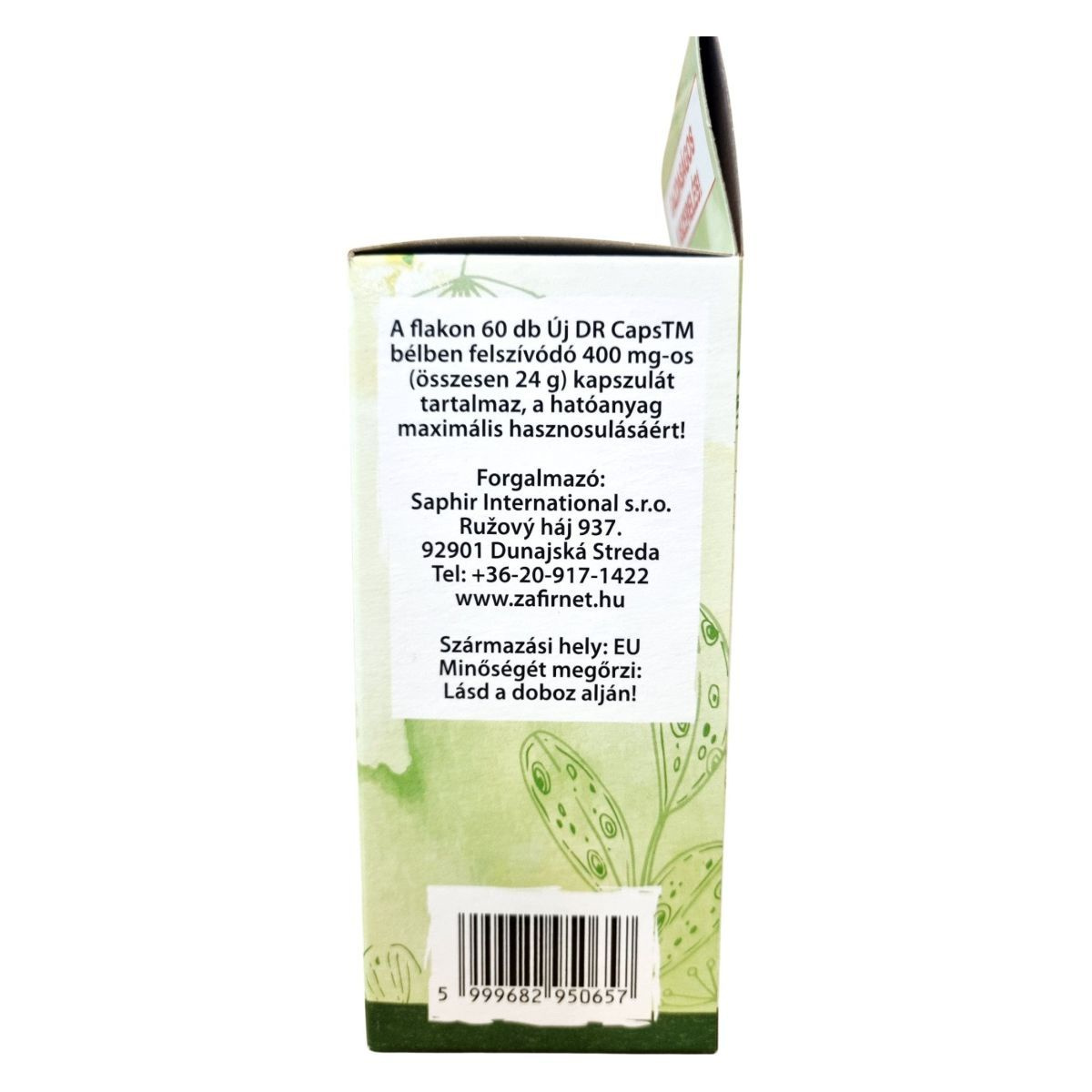 A Zafir Egynyári Üröm DR porkapszula 100% természetes összetevőkből, gondosan ellenőrzött alapanyagból készül. A flakon 60 db, új DR Caps™ bélben felszívódó 400 mg-os kapszulát tartalmaz, összesen 24 g nettó tömeggel, a hatóanyag maximális hasznosulásáért. A termék 4× hatékonyabb felszívódásra lett tervezve, gazdaságos kiszerelésben. A természet erejével segíthet a szervezet védekezőképességének fenntartásában. Származási hely: EU. Minőségét megőrzi a doboz alján jelzett időpontig. Forgalmazó: Saphir International s.r.o., Dunajska Streda. Vonalkód: 5999682950657.