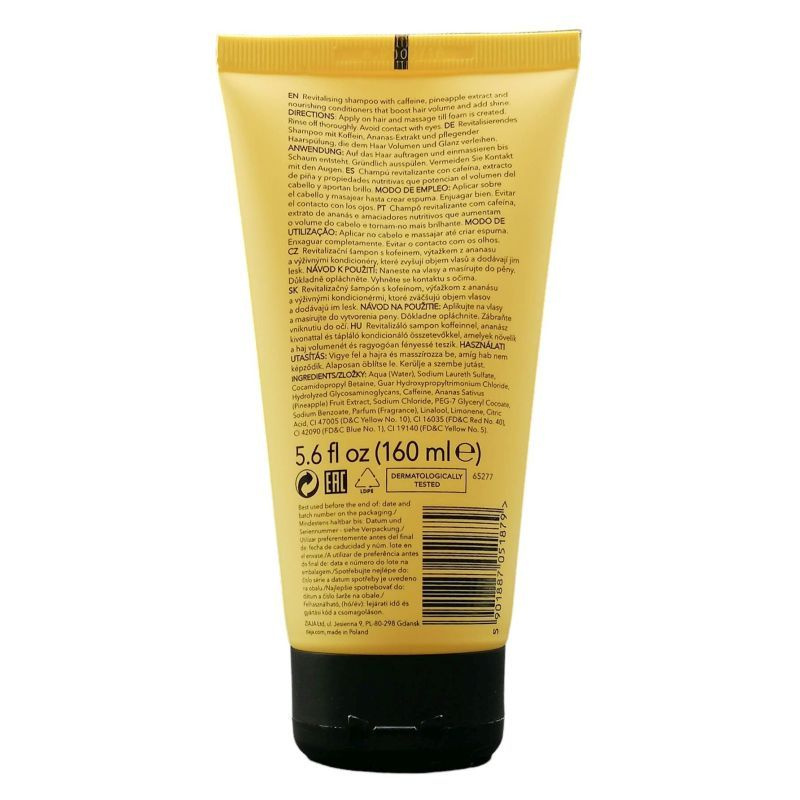 Összetevők: Aqua (Water), Sodium Laureth Sulfate, Cocamidopropyl Betaine, Guar Hydroxypropyltrimonium Chloride, Polyquaternium-10, Hydrolyzed Glycosaminoglycans, Caffeine, Ananas Sativus (Pineapple) Fruit Extract, Sodium Chloride, PEG-7 Glyceryl Cocoate, Sodium Benzoate, Parfum (Fragrance), Linalool, Limonene, Citric Acid, CI 47005 (D&C Yellow No. 10), CI 16035 (FD&C Red No. 40), CI 42090 (FD&C Blue No. 1), CI 19140 (FD&C Yellow No. 5).