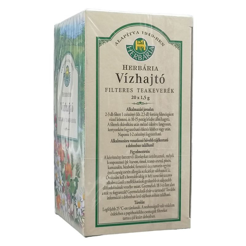 Gyógyszernek nem minősülő gyógyhatású készítmény, melynek hatását népgyógyászati adatok igazolják. Mi a teakeverék összetevője? 1 filter tasak 0, 30 g Kamillavirágzatot (Matricariae flos), 0, 30 g Nyírfalevelet (Betulae folium), 0, 225 g Tarackbúza gyökértörzset (Graminis rhizoma), 0, 15 g Borsosmenta levelet (Menthae piperitae folium), 0, 15 g Igazi édesgyökeret (Liquiritiae radix), 0, 15 g Lestyán gyökeret (Levistici radix), 0, 15 g Mezei zsurló meddő hajtást (Equiseti herba), 0, 075 g Csalánlevelet (Urticae folium) tartalmaz porított formában. Mit tartalmaz még a készítmény? A teakeverék a gyógynövényeken kívül mást nem tartalmaz. Mikor ajánlott a készítmény alkalmazása? Vízhajtóként a vesehomok és apróbb vesekövek eltávolításának megkönnyítésére, húgyutak fertőtlenítésére, enyhe görcsoldásra alkalmazható. Mikor nem ajánlott a készítmény alkalmazása? Ne alkalmazza a teát szív-, és veseelégtelenségből adódó ödéma esetén, valamint ha bármely összetevővel szemben egyéni túlérzékenysége van. Mit kell tudni az alkalmazás megkezdése előtt? Összetevőinek hatóanyagai (szaponinok, illóolajok) a veseműködésre kifejtett enyhe stimuláló hatásuk következtében fokozzák a vizelet kiválasztását, elősegítik a vesehomok és az apróbb vesekövek eltávozását, enyhe görcsoldó és húgyúti fertőtlenítő hatásúak. Krónikus cukor-, szív-, és vesebetegségben valamint magas vérnyomásban szenvedők a tea kiegészítő kezelésként történő alkalmazását beszéljék meg kezelőorvosukkal. Alkalmazhatják-e a készítményt gyermekek? A teakeverék alkalmazása gyermekeknek nem ajánlott. Alkalmazható-e a teakeverék más gyógyszerekkel? Nem állnak rendelkezésre vizsgálati adatok arra vonatkozóan, hogy a tea fogyasztása befolyásolja-e más készítmények felszívódását. Amennyiben Ön vízhajtó gyógyszert szed, úgy a teafogyasztás megkezdése kellő óvatossággal történjen. Várandósság és szoptatás ideje alatt alkalmazható-e a tea? Ezen élethelyzetekben végzett célzott irányú vizsgálatok hiányában a teakeverék alkalmazása nem javasolt. Hogyan és milyen adagolásban kell a teát fogyasztani? 2-3 db filter tasakot forrázzunk le egy csészényi (kb. 2, 5 dl) forró vízzel. 10-15 percig lefedve hagyjuk állni. A filtereket eltávolítva tetszőleges hőmérsékleten és ízesítéssel (pl. édesítve) fogyasztjuk. Reggel és este 1-1 csészényi fogyasztható. Milyen nem várt hatást okozhat a készítmény? Az adagolási javaslat betartása esetén is esetleges egyéni túlérzékenység (allergia) előfordulhat. Ha nem várt hatást észlel, hagyja abba a tea fogyasztását és forduljon orvosához. Mire kell még ügyelni a készítmény alkalmazása során? A teakeveréket gyermekek elől el kell zárni! A dobozon feltüntetett lejárati időn túl ne fogyassza a teát! Mennyi ideig alkalmazható a készítmény? A teakeverék kúraszerűen (legfeljebb 3-4 hétig) fogyasztható, de ha panaszai nem szűnnek, vagy rosszabbodnak, azonnal keresse fel kezelőorvosát.
