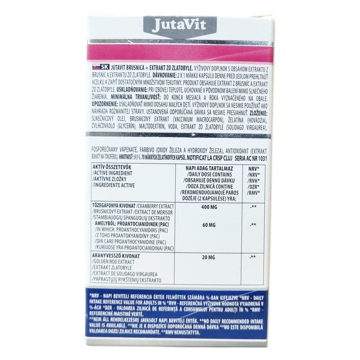 A JutaVit Tőzegáfonya + Aranyvessző kivonat lágyzselatin kapszulában található étrend-kiegészítő készítmény Vaccinium macrocarpon (tőzegáfonya) és Solidago virgaurea (aranyvessző) kivonatot tartalmaz. A napi adag két lágykapszula, melyeket étkezés előtt ajánlott bő folyadékkal lenyelni. A termék összetevői között napraforgóolaj, marha eredetű zselatin, valamint antioxidánsként tokóferolban gazdag kivonat szerepel. A készítményt szobahőmérsékleten, napfénytől védve, gyermekektől elzárva kell tárolni. A táplálékkiegészítő nem helyettesíti a változatos étrendet és az egészséges életmódot, illetve az ajánlott napi adagot nem szabad túllépni. A termék nettó tömege 69,9 g, mely 70 darab lágyzselatin kapszulát tartalmaz. A gyártó a Juvapharma Kft., Magyarország.
