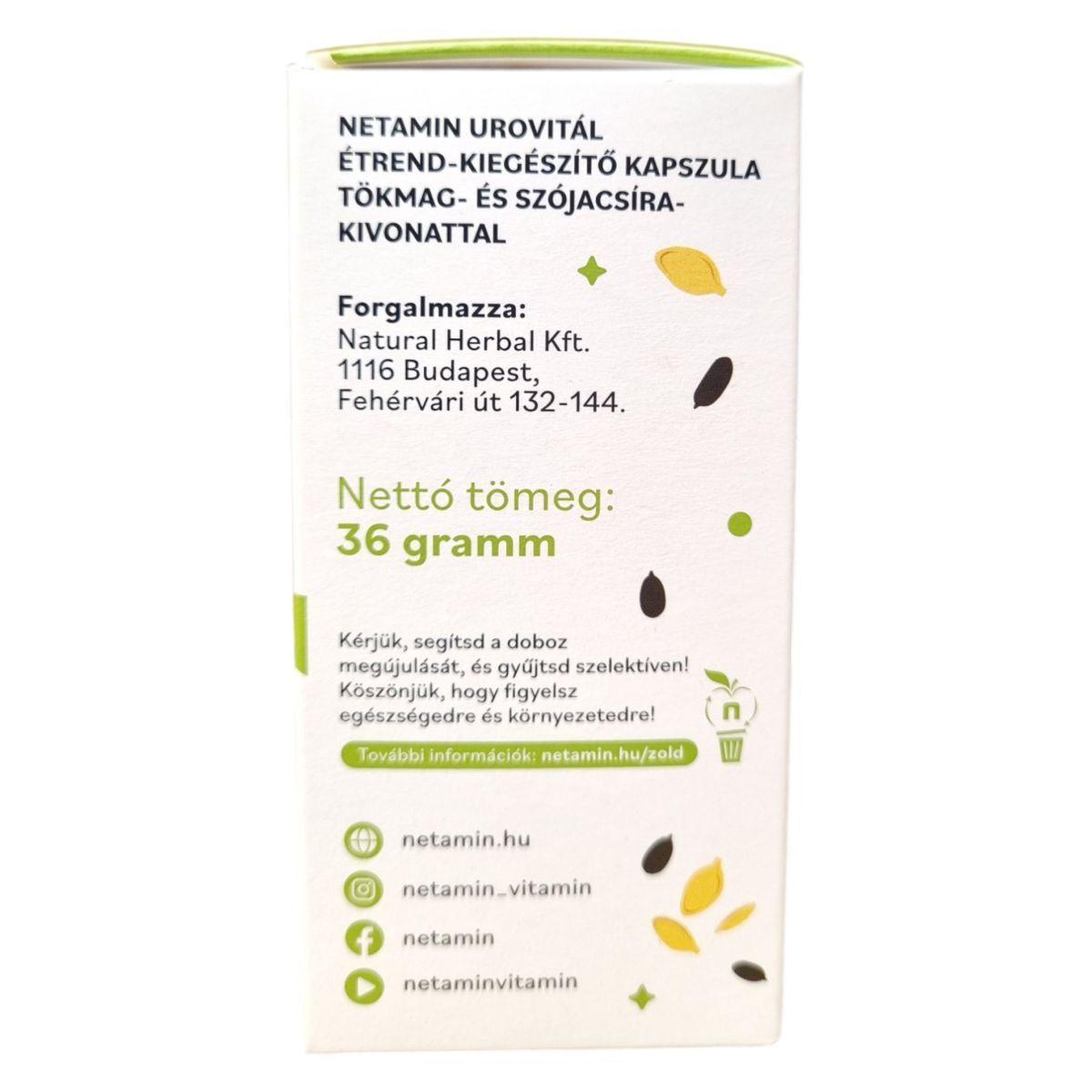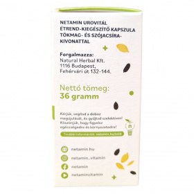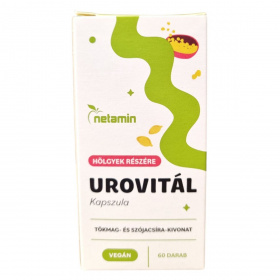A Netamin Urovitál kapszula kifejezetten hölgyek számára készült, tökmag- és szójacsíra-kivonat kombinációjával. A termék 100% vegán, és növényi kapszulában található. A szójacsíra-kivonat 40% izoflavon-tartalomra standardizált, ami hozzájárulhat a nők egészségének támogatásához. A kapszulák napi kétszeri fogyasztása javasolt bő folyadékkal, lehetőleg étkezés közben. Fontos, hogy az ajánlott napi adagot ne lépje túl, és az étrend-kiegészítő nem helyettesíti a vegyes étrendet és az egészséges életmódot. A termék forgalmazója a Natural Herbal Kft., és a kapszulák nettó tömege 36 gramm.