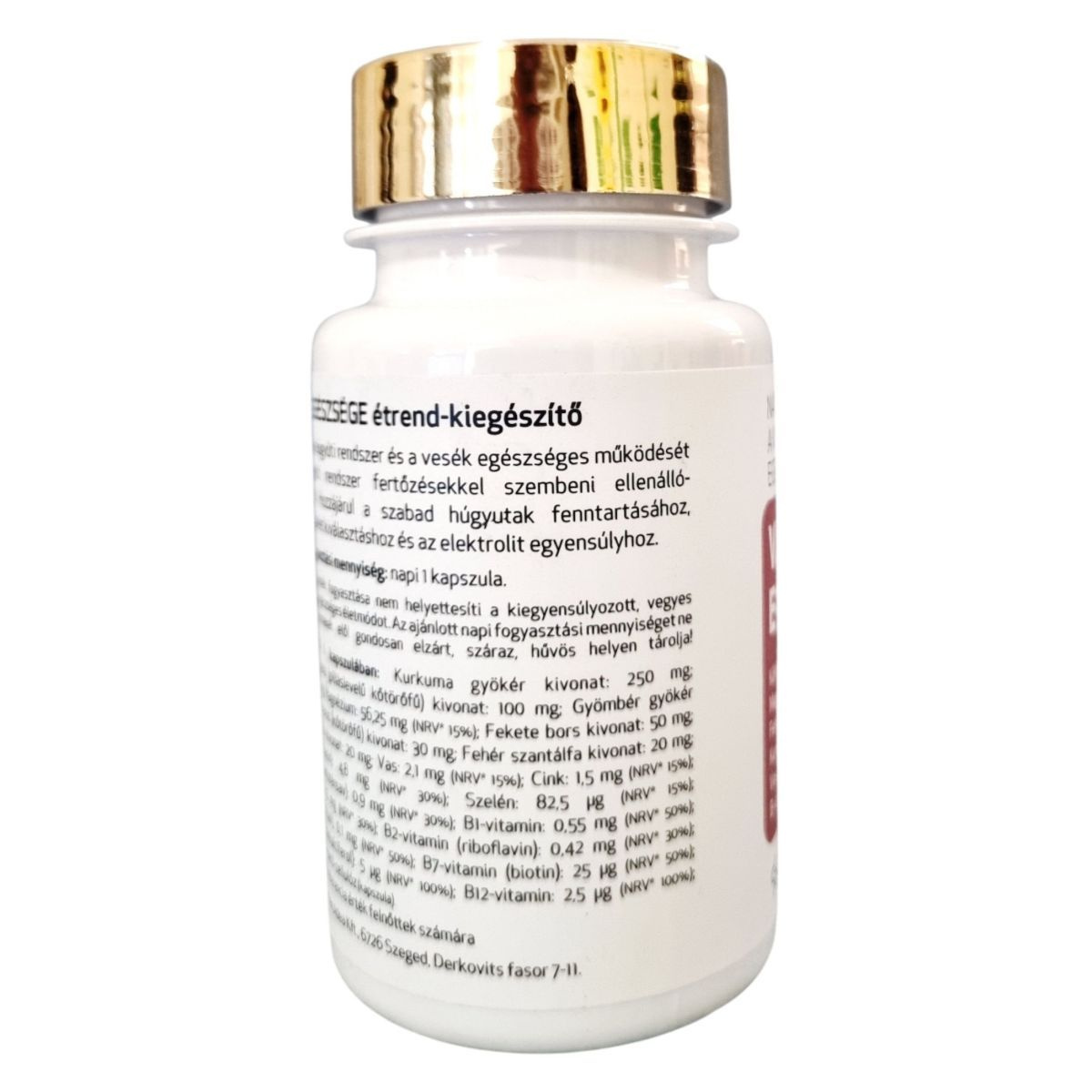 A VESÉK EGÉSZSÉGE étrend-kiegészítő célja, hogy támogassa a vesék és a húgyúti rendszer egészséges működését. A termék különböző növényi kivonatokat és ásványi anyagokat tartalmaz, mint például kurkuma, gyömbér, kőtörőfű, magnézium, vas és cink. Ezek az összetevők hozzájárulhatnak a húgyúti rendszer fertőzésekkel szembeni ellenállóképességéhez, a normál vizelet kiválasztáshoz és az elektrolit egyensúly fenntartásához. A termék napi egy kapszula fogyasztását javasolja, és hangsúlyozza, hogy nem helyettesíti a kiegyensúlyozott étrendet és az egészséges életmódot.