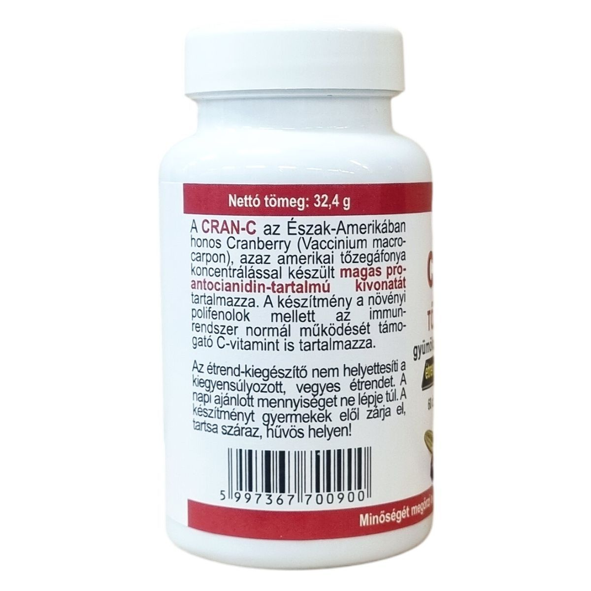A CRAN-C kapszula az Észak-Amerikában honos amerikai tőzegáfonya (Vaccinium macrocarpon) koncentrált kivonatát tartalmazza, amely magas proantocianidin-tartalommal rendelkezik. A készítmény emellett C-vitamint is tartalmaz, amely támogatja az immunrendszer normál működését. A termék 60 darab, egyenként 540 mg-os kapszulát tartalmaz, ami 30 napi adagnak felel meg. A kapszulahéj zselatinból készül, további összetevők a L-aszkorbinsav és magnézium-sztearát. A termék fogyasztásakor legalább 2 liter folyadék fogyasztása javasolt, a biztonságos és hatékony használat érdekében.