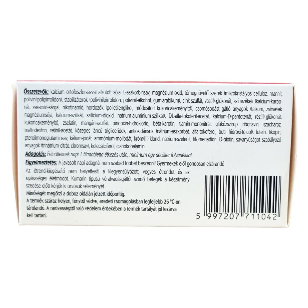 kalcium ortofoszforsavval alkotott sója, L-aszkorbinsav, magnézium-oxid, mikrokristályos cellulóz, mannit, polivinilpolipirrolidon, polivinilpirrolidon, polivinil-alcohol, gumiarábikum, cink-szulfát, vas(II)-glükonát, kalcium-karbonát, vas-oxid-sárga, nikotinamid, polietilénglikol, módosított kukoricakeményítő, talkum, zsírsavak magnéziumsója, kalcium-szilikát, szilícium-dioxid, nátrium-alumínium-szilikát, DL-alfa-tokoferil-acetát, kalcium-D-pantotenát, réz(II)-glükonát, kukoricakeményítő, zselatin, mangán-szulfát, piridoxin-hidroklorid, béta-karotin, tiamin-mononitrát, glükózszirup, riboflavin, szacharóz, maltodextrin, retinil-acetát, közepes láncú trigliceridek, nátrium-aszkorbát, alfa-tokoferol, butil hidroxi-toluol, lutein, likopin, pteroilmonoglutaminsav, kálium-jodát, ammónium-molibdát, króm(III)-klorid, nátrium-szelenit, fitomenadion, D-biotin, trinátrium-citrát, citromsav, kolekalciferol, cianokobalamin.