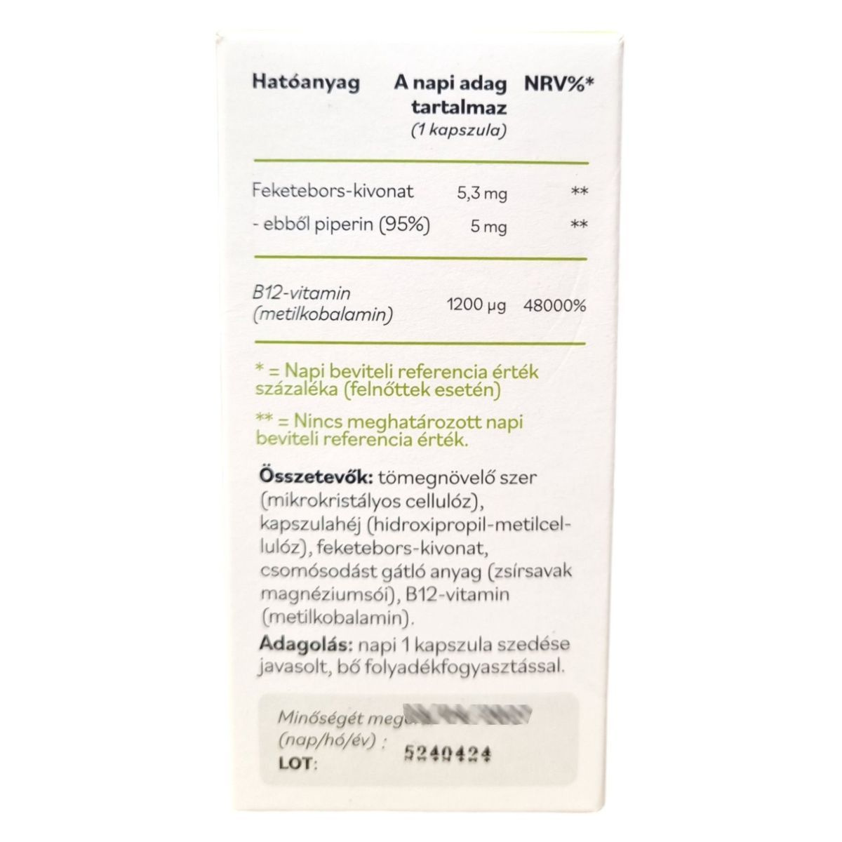 tömegnövelő szer (mikrokristályos cellulóz), kapszulahéj (hidroxipropil-metilcellulóz), feketebors-kivonat, csomósodást gátló anyag (zsírsavak magnéziumsói), B12-vitamin (metilkobalamin).