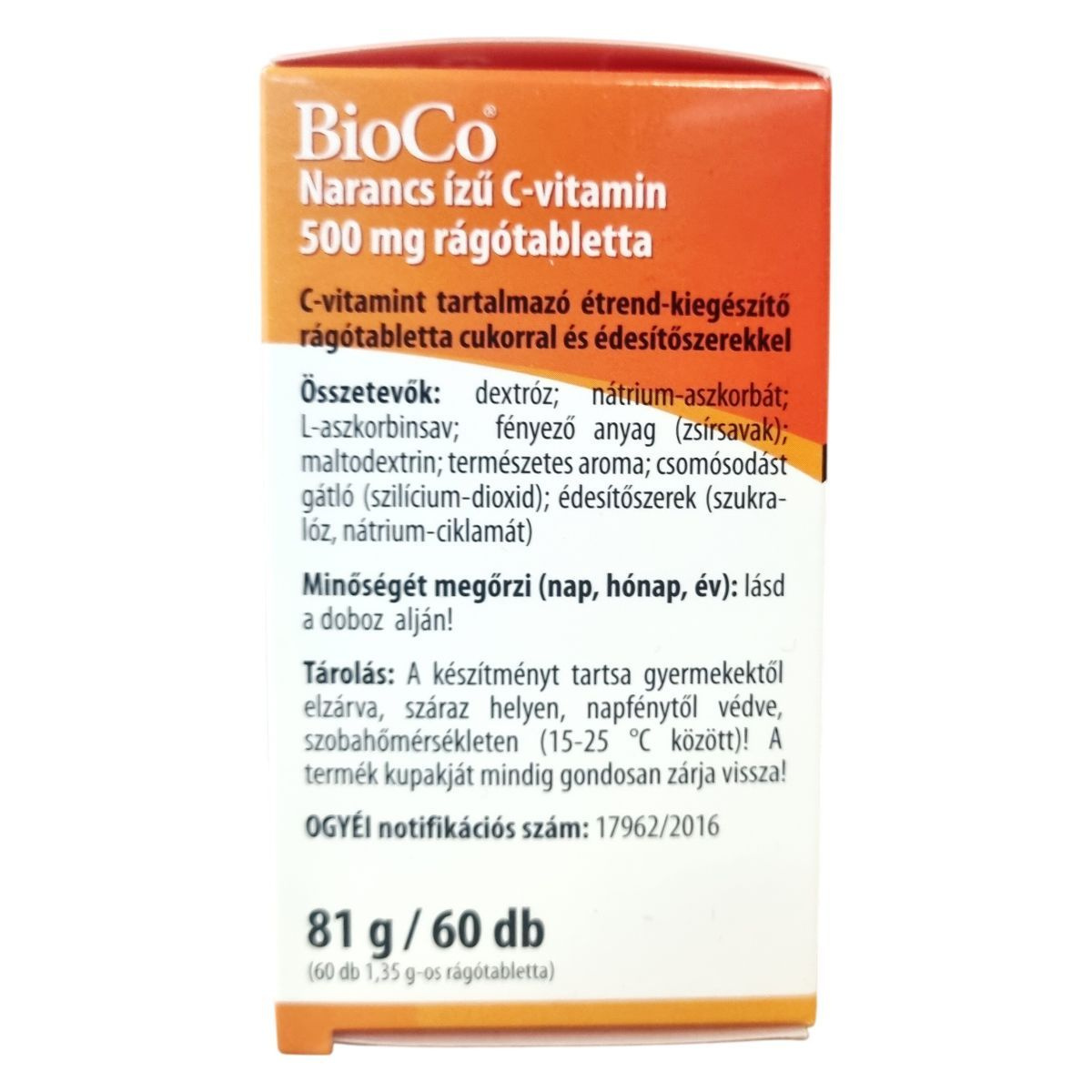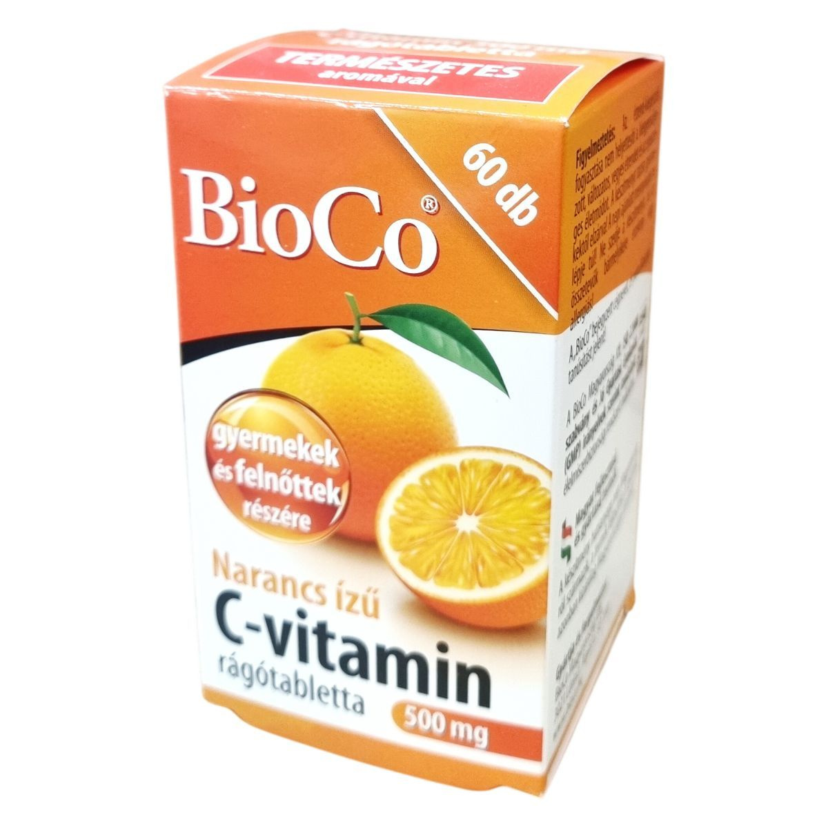 A BioCo Narancs ízű C-vitamin rágótabletta 500 mg C-vitamint tartalmaz, melyet természetes aromával ízesítenek. A termék elsősorban azoknak ajánlott, akik a vízzel lenyelhető tabletta helyett inkább rágótablettával szeretnék biztosítani szervezetük C-vitamin ellátottságát, illetve nyelési nehézséggel küzdőknek, például gyermekeknek vagy időseknek. Különösen javasolt fokozott C-vitamin szükséglet idején, egyoldalú vagy vitaminhiányos táplálkozás esetén, illetve betegséget követő regeneráció során. A termék magyar fejlesztésű és gyártású, a hatóanyag nem Magyarországról származik, azonban a fejlesztés és gyártás kizárólag Magyarországon történik. A BioCo Magyarország Kft. tanúsított élelmiszerbiztonsági rendszert működtet, megfelelve az ISO 22000 szabványnak és a GMP előírásainak. A csomagolás 60 db rágótablettát tartalmaz, egyenként 1,35 g súlyban.