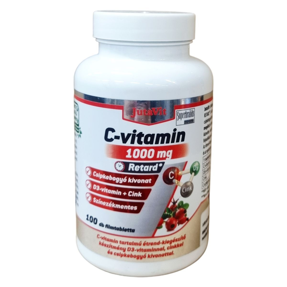 A JutaVit C-vitamin 1000 mg Retard egy C-vitamin tartalmú étrend-kiegészítő, mely D3-vitamint, cinket és csipkebogyó kivonatot is tartalmaz. Színezékmentes készítmény, amely nem tartalmaz titán-dioxidot és vas-oxidot. A termék napi egy filmtabletta formájában fogyasztható, amely támogatni segítheti a szervezet C-vitamin-, D-vitamin- és cink ellátását. Kisgyermekek elől elzárva kell tartani, és nem helyettesíti a változatos étrendet és egészséges életmódot.