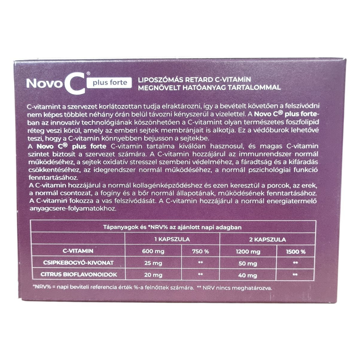A Novo C® plus forte liposzómás retard C-vitamin készítmény természetes foszfolipid burkolattal készült, amely lehetővé teheti a C-vitamin könnyebb sejtekbe jutását és jobb hasznosulását. A C-vitamin hozzájárulhat az immunrendszer normál működéséhez, a sejtek oxidatív stresszel szembeni védelméhez, a fáradtság és kifáradás csökkentéséhez, az idegrendszer normál működéséhez, a pszichológiai funkciók fenntartásához, valamint a normál kollagénképződéshez, amely a porcok, erek, csontozat, fogíny és bőr egészségéért felelős. Továbbá fokozhatja a vas felszívódását, és támogathatja a normál energiatermelő anyagcsere-folyamatokat. A termék csipkebogyó-kivonatot és citrus bioflavonoidokat is tartalmaz, amelyek a C-vitamin hatását kiegészíthetik.