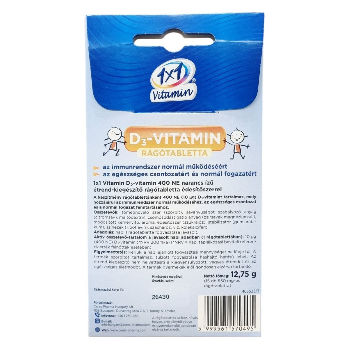 Az 1x1 Vitamin D3-vitamin rágótabletta narancs ízű, édesítőszerekkel készült étrend-kiegészítő, amely 15 darab, egyenként 850 mg-os tablettát tartalmaz összesen 12,75 g nettó tömeggel. A készítmény egy tablettában 400 NE (10 µg) D3-vitamint tartalmaz, mely hozzájárulhat az immunrendszer megfelelő működéséhez, valamint támogathatja az egészséges csontozat és fogazat fenntartását. A termék előállítása az Európai Unió területén történik. A gyártási szám a termék azonosítását szolgálja.