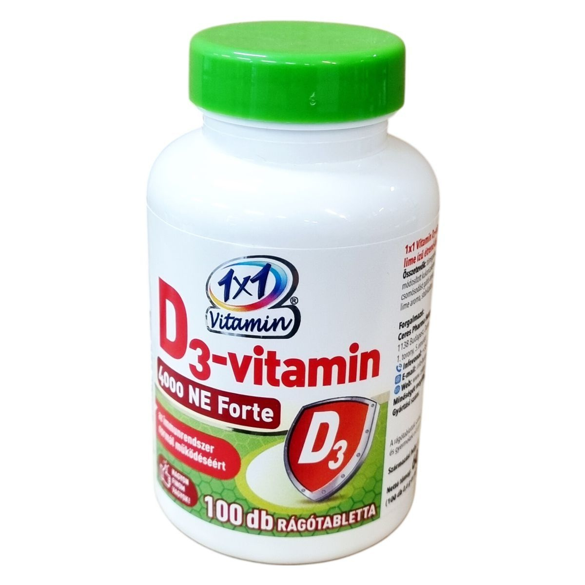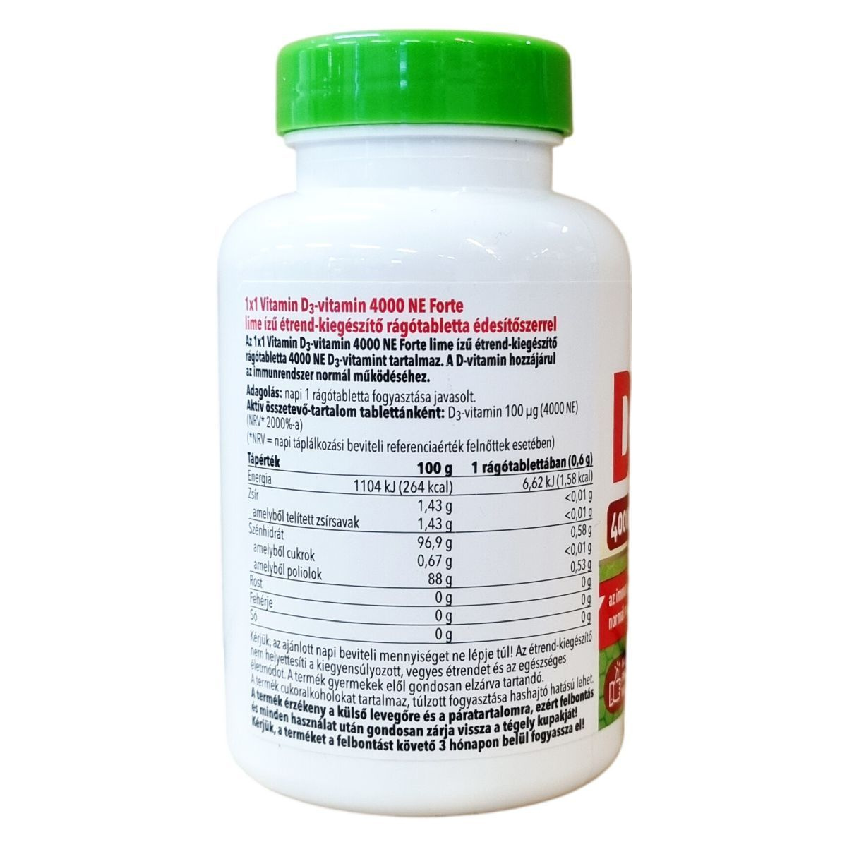 Az 1x1 Vitamin D3-vitamin 4000 NE Forte lime ízű étrend-kiegészítő rágótabletta 4000 NE D3-vitamint tartalmaz. A termék cukoralkoholokat is tartalmaz, így túlzott fogyasztása hashajtó hatást válthat ki. Nettó tömege 60 g, amely 100 darab 0,6 g-os tablettát jelent. A termék származási helye az Európai Unió.