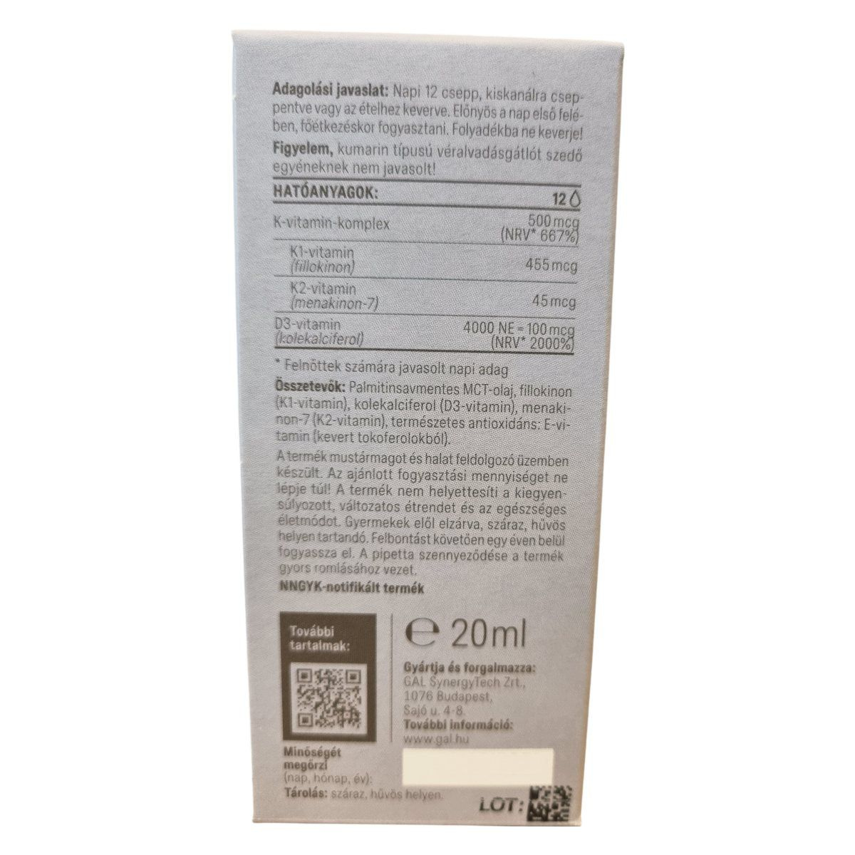 A készítmény 500 mcg K-vitamin-komplexet és 4000 NE D3-vitamint tartalmaz napi adagban, amely ~60 adagot biztosít egy 20 ml-es üvegben. A hatóanyagok természetes formában vannak jelen, a K2-vitamin bioaktív MK-7-es változata szójamentes forrásból származik. A gyártói leírás szerint a termék palmitinsavmentes, RSPO-minősítésű (fenntartható gazdálkodásból származó) pálma- vagy kókuszolajból nyert MCT-olajban oldva tartalmazza hatóanyagait. A készítmény a K-vitaminok „transz” formáit alkalmazza, elkerülve a kevésbé hatásos „cisz” formát. TÜV / ISO 9001:2015 tanúsított folyamatok előírásai szerint készült.