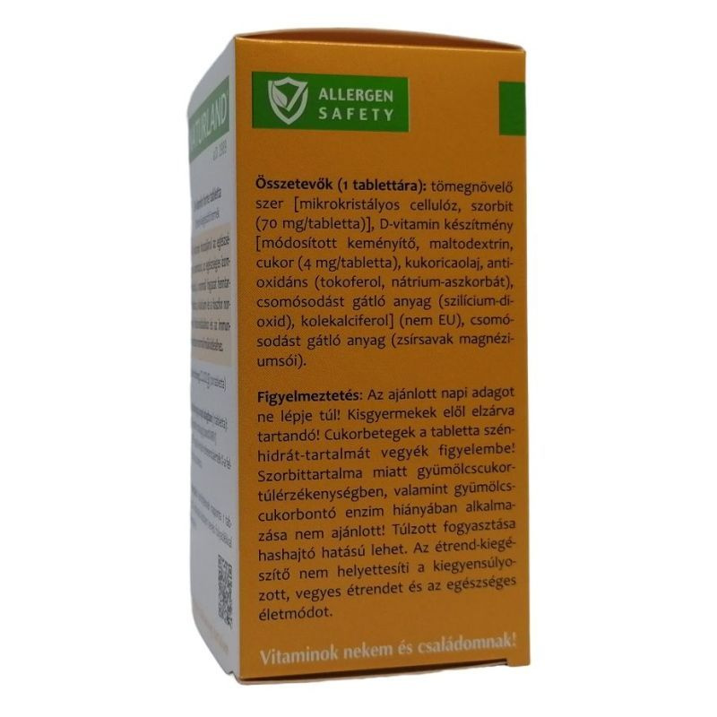 A D-vitamin hozzájárul a kalcium és a foszfor normál felszívódásához és az immunrendszer normál működéséhez. Nettó tömeg: 22,02 g (120 x 183,5 mg tabletta). Minőségét megőrzi: a csomagoláson jelzett hónap végéig (hónap, év). Tárolás: legfeljebb 25 °C-on, fénytől védett, száraz helyen, gyermekek elől elzárva. Adagolás: naponta 1 db tabletta, étkezés közben kevés folyadékkal lenyelve.