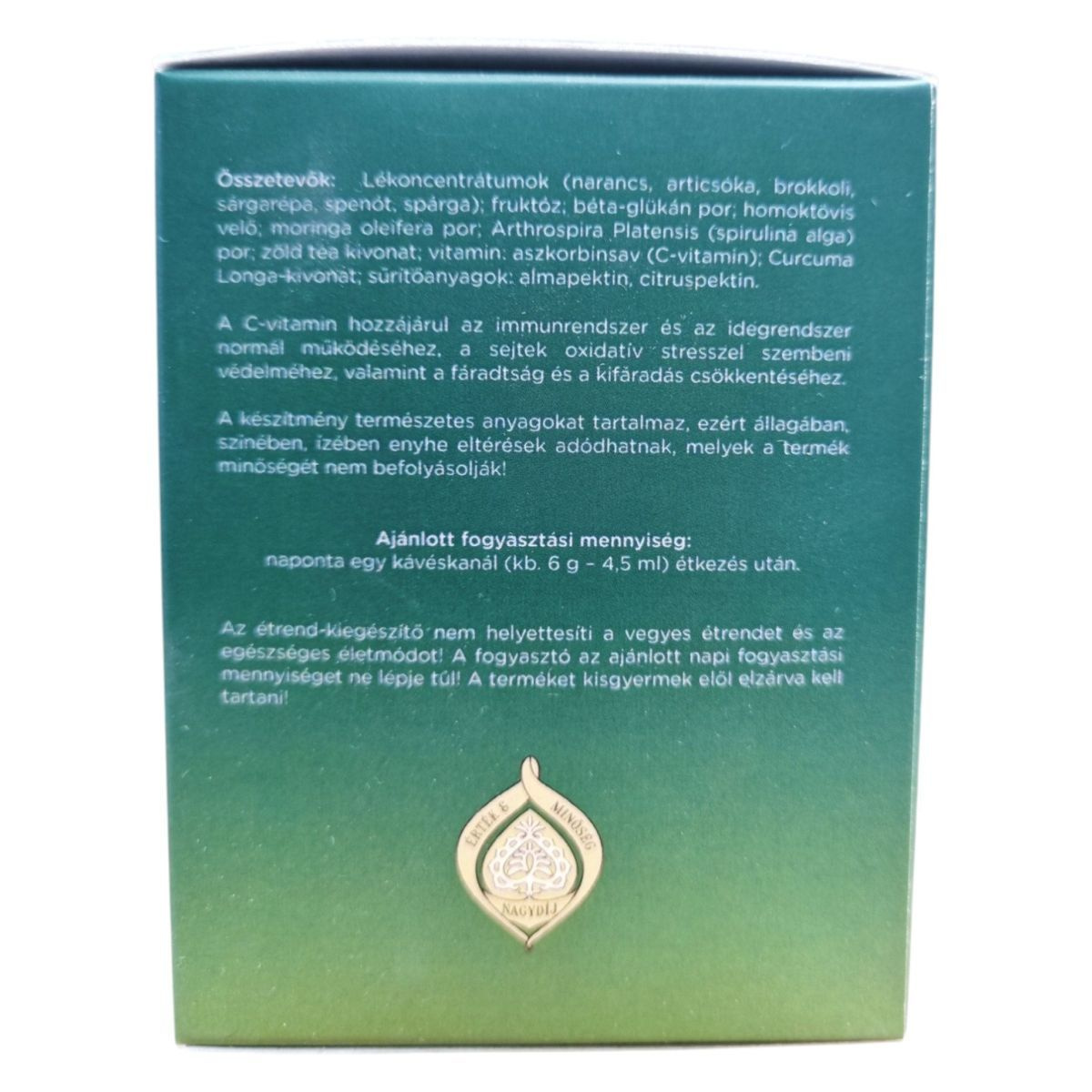 Lékoncentrátumok (narancs, articsóka, brokkoli, sárgarépa, spenót, spárga); fruktóz; béta-glükán por; homoktövis velő; moringa oleifera por; Arthrospira Platensis (spirulina alga) por; zöld tea kivonat; vitamin: aszkorbinsav (C-vitamin); Curcuma Longa-kivonat; sűrítőanyagok: almapektin, citruspektin.