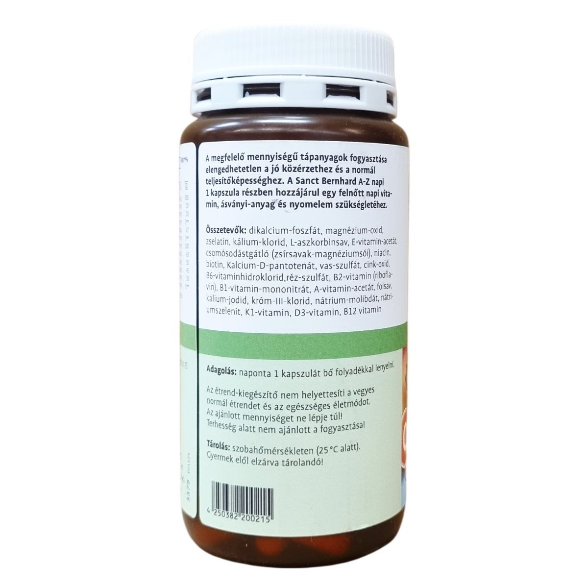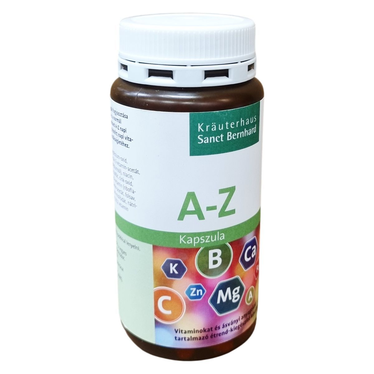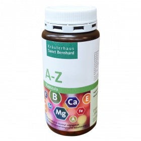 A megfelelő mennyiségű tápanyagok fogyasztása elengedhetetlen a jó közérzethez és a normál teljesítőképességhez. A Sanct Bernhard A-Z kapszula napi egy kapszula adagban részben hozzájárulhat egy felnőtt napi vitamin-, ásványi-anyag- és nyomelem-szükségletéhez. A termék 150 kapszulát tartalmaz, összsúlya 104 gramm. A készítmény Németországban készült, gyártója a Kräuterhaus Sanct Bernhard KG.