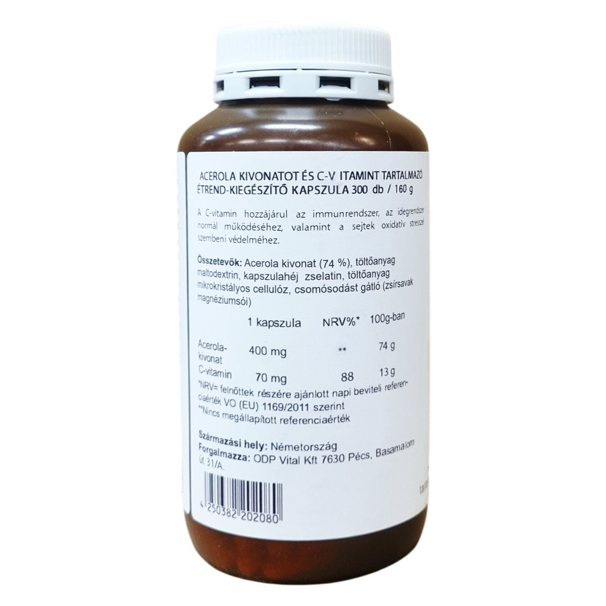 Az Acerola kapszula Acerola kivonatot és C-vitamint tartalmazó étrend-kiegészítő készítmény, amit naponta egyszer ajánlott főétkezés közben bevenni. A termék hozzájárulhat az immunrendszer és az idegrendszer normál működéséhez, valamint a sejtek oxidatív stresszel szembeni védelméhez. A kapszulák 74%-ban tartalmazzák az acerola kivonatot, továbbá töltőanyagokként maltodextrint és mikrokristályos cellulózt, valamint kapszulahéjként zselatint tartalmaznak, a csomósodás megakadályozására zsírsavak magnéziumsóit alkalmazzák. A terméket Németországban állítják elő, és a forgalmazásért az ODP Vital Kft. felelős. Az étrend-kiegészítő tárolását fénytől védett, száraz helyen, 25 °C alatt javasolt végezni, és nem helyettesíti a változatos étrendet és egészséges életmódot. Gyermekek elől gondosan el kell zárni.