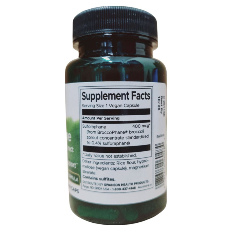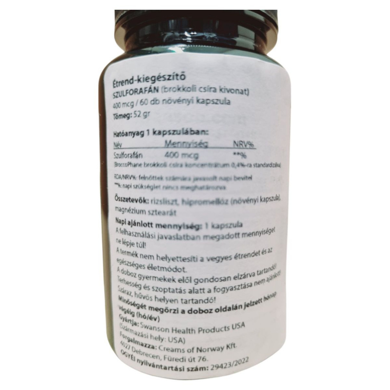 A Swanson Szulforafán étrend-kiegészítő brokkoli csíra kivonatot tartalmaz, amely szulforafánban gazdag. A termék napi adagja egy kapszula, amely 400 mcg szulforafánt biztosít. A kapszulák növényi alapúak, így vegetáriánusok számára is alkalmasak lehetnek. A termék tartalmaz szulfitokat, ezért allergiások számára nem ajánlott. A termék használata nem javasolt terhesség és szoptatás alatt. A termék minőségét a doboz oldalán jelzett hónap végéig őrzi meg. Forgalmazza a Creams of Norway Kft., Debrecen.