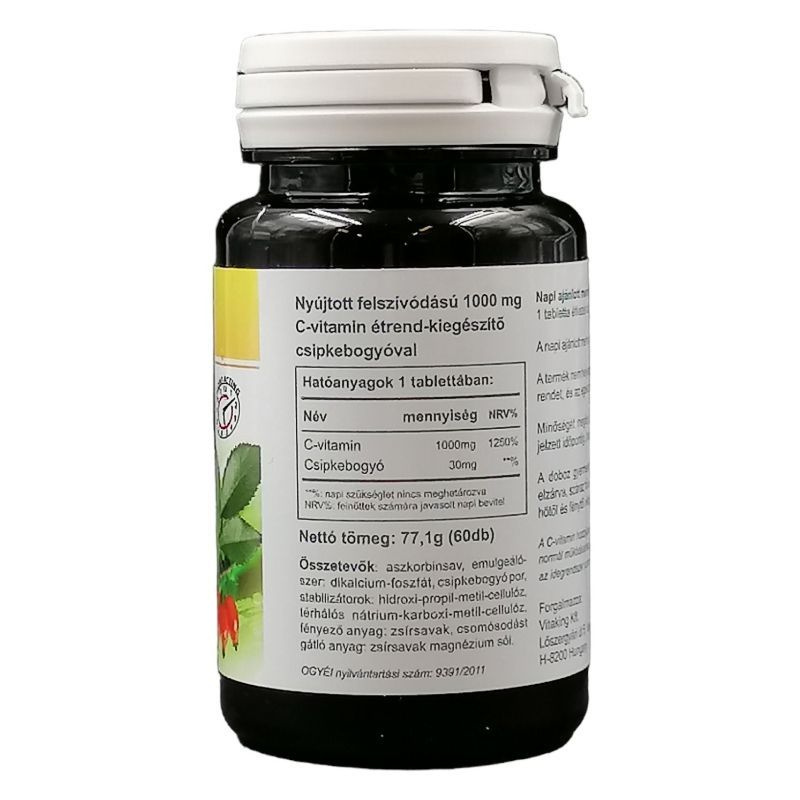 Antioxidáns hatása révén hozzájárul a szervezetben zajló káros oxidatív folyamatok gátlásához, fontos szerepet játszik a szervezet védekező rendszerének működésében, segíti az immunrendszer megfelelő működését, szükséges az idegrendszer normál működéséhez, hozzájárul a haj, a bőr és a köröm egészségének megőrzéséhez, nélkülözhetetlen az egészséges fogazat, csontozat és íny felépítéséhez, fontos szerepe van a vas felszívódásában, elősegíti a szív és a keringési rendszer egészséges működését, szerepet játszik a vérerek normál struktúrájának fenntartásában. A hivatalos álláspont szerint egészséges ember napi C-vitamin szükségletét a helyesen összeállított és jó konyhatechnikával elkészített ételekkel még a tél végi és tavaszi hónapokban is fedezni lehet. Napi ajánlott mennyiség 1 kapszula. A felhasználási javaslatban megadott mennyiséget ne lépje túl! Hatóanyagok - 1 db kapszulában: C-vitamin (aszkorbinsav) 1000 mg, csipkebogyó 60 mg.